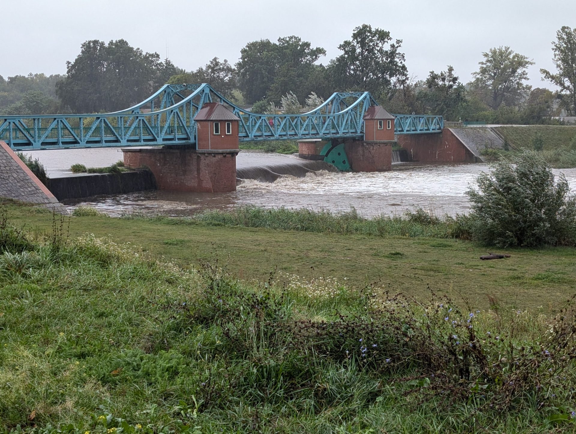 Woda jest wciąż w korycie rzeki, zarówno w pierwotnym biegu Odry jak również w kanale przeciwpowodziowym. Wejście na wały od strony parkingu jest niemożliwe i pilnowane przez funkcjonariuszy policji.