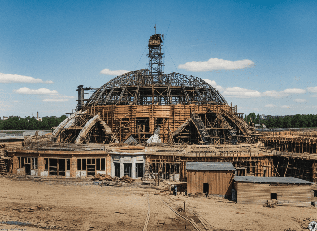 Podczas budowy zastosowano nowatorskie rozwiązania techniczne. Robotnicy pracowali między innymi z kolejki linowej, która zawisła między kopułą a dwoma wieżami poruszającymi się po torach wzdłuż powstającego budynku. Konstrukcja była tak innowacyjna, że wielu wątpiło w jej powodzenie.